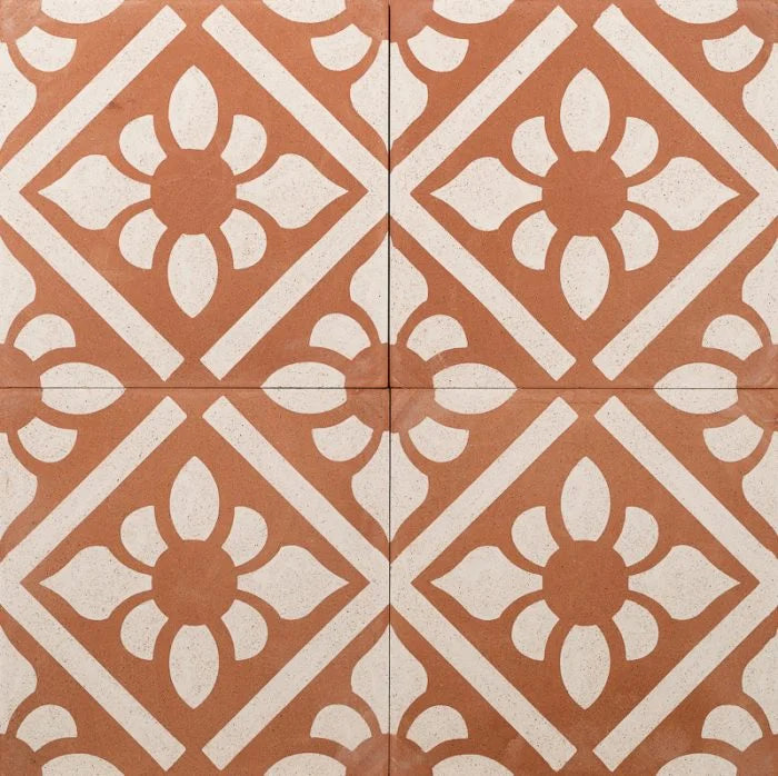 Terrazzo Lily Tile. A gorgeous combination of terracotta and off white colours with the effect of terrazzo give this tile impact wherever it is seen. The beautiful oriental lily pattern adds to the statement of this design, full of life and zest.