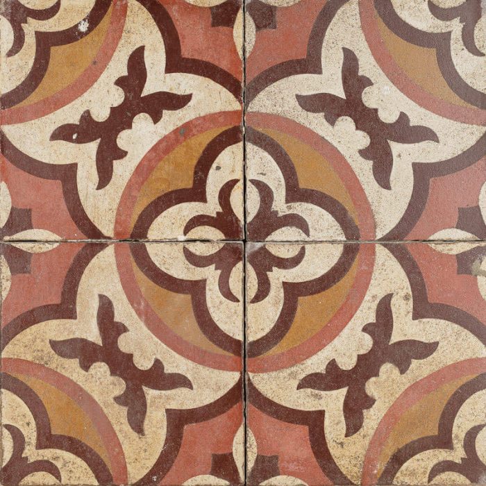 Toulouse Antique Tile. Beautiful colours of muted pinks, oranges, maroon and white bring life to the vibrant pattern. Toulouse Antique for any interior.
