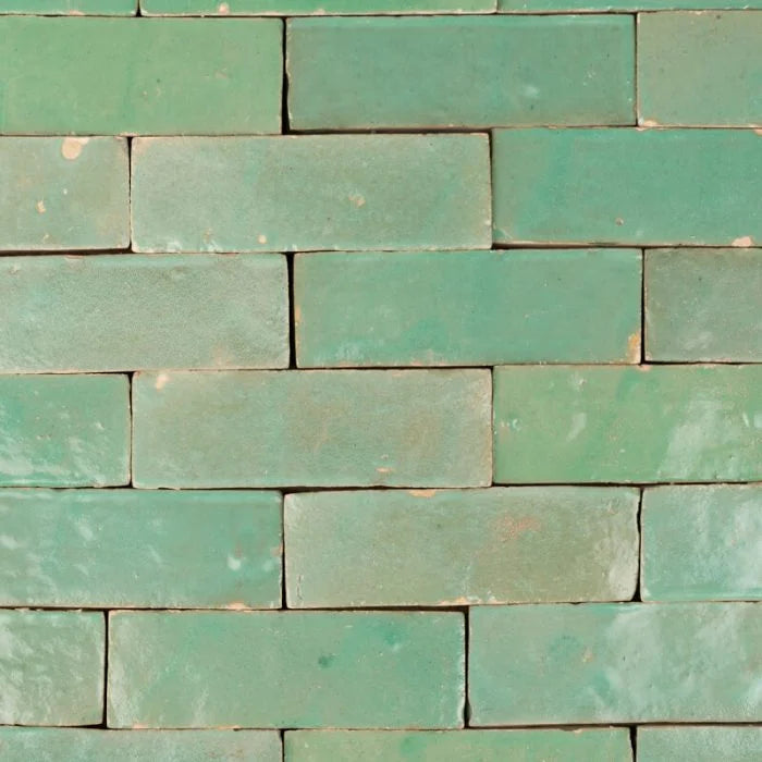 Turquoise Glazed Bricks Tile. Vibrant, turquoise green coloured thick bricks with hues of jade. Turquoise Glazed Bricks are handmade in Morocco with the exquisite� zesty turquoise� glaze applied brining life to any interior.