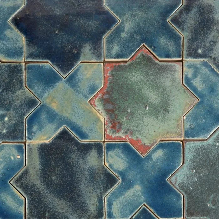 Velvet Blue Glossy Estrella. Shapes of stars and crosses add depth and intrigue to these mixed blue glazed tiles. The Velvet Blue Glossy Estrella enable you to have the unique star and cross pattern using only one colour, Velvet Blue! For samples you will receive one of each (star and cross).
