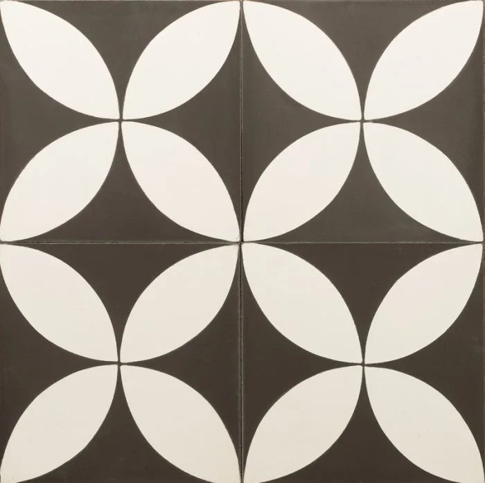 White Fleur Tile. A black tile with a bold big white petal shapes that make up a circular pattern. White Fleur Tile to bring drama and life to any interior.