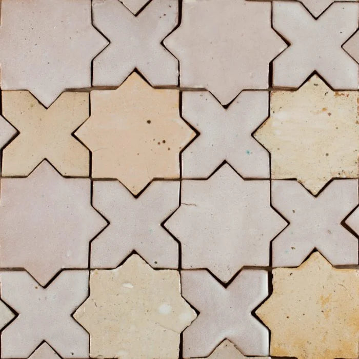 White Glossy Estrella. Shapes of stars and crosses add depth and intrigue to these mixed white glazed tiles. The White Glossy Estrella enable you to have the unique star and cross pattern using only one colour, White! For samples you will receive one of each (star and cross).