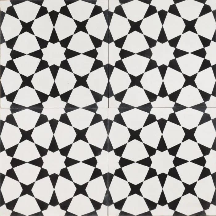 White Moroccan Mosaic Tile. A contrasting tile with a vivid black and white pattern of stars and shapes. White Moroccan Mosaic to compliment any interior.
