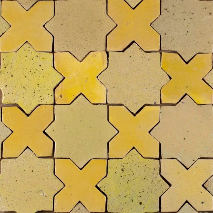 Yellow Glossy Estrella. Shapes of stars and crosses add depth and intrigue to these mixed yellow glazed tiles. The Yellow Glossy Estrella enable you to have the unique star and cross pattern using only one colour, Yellow! For samples you will receive one of each (star and cross).